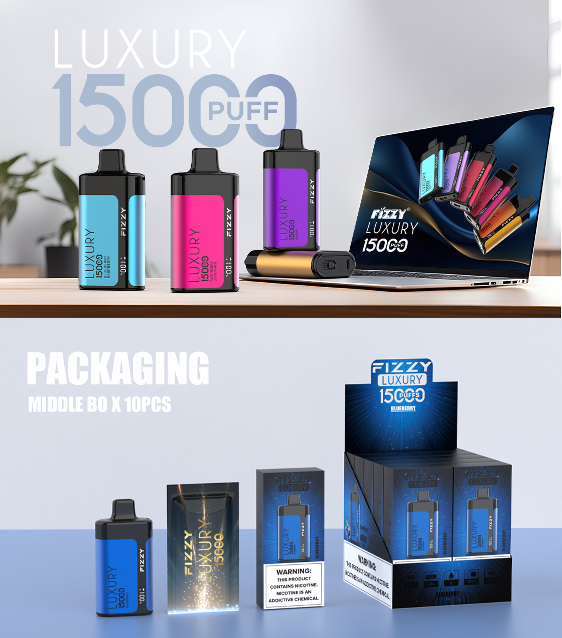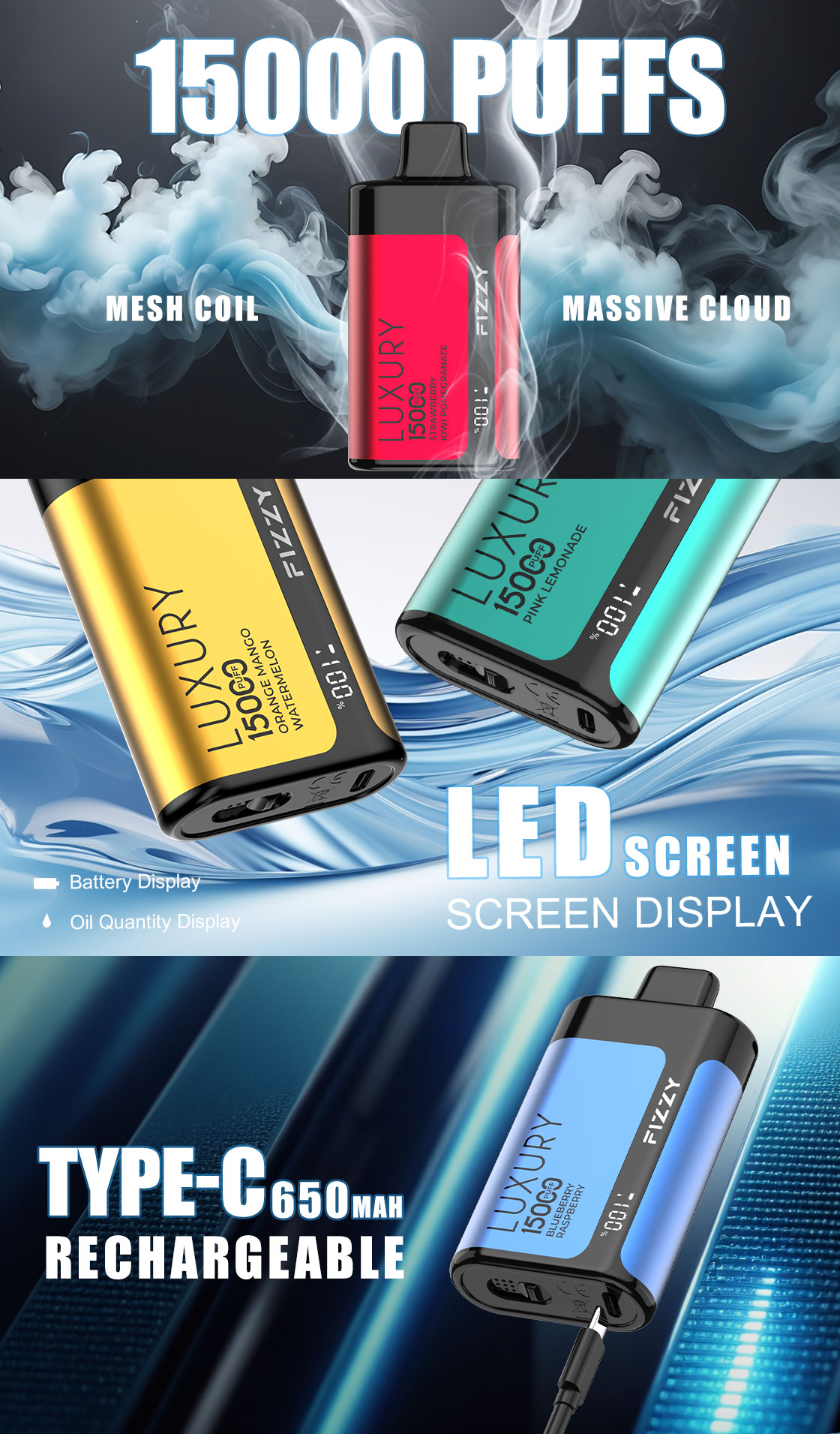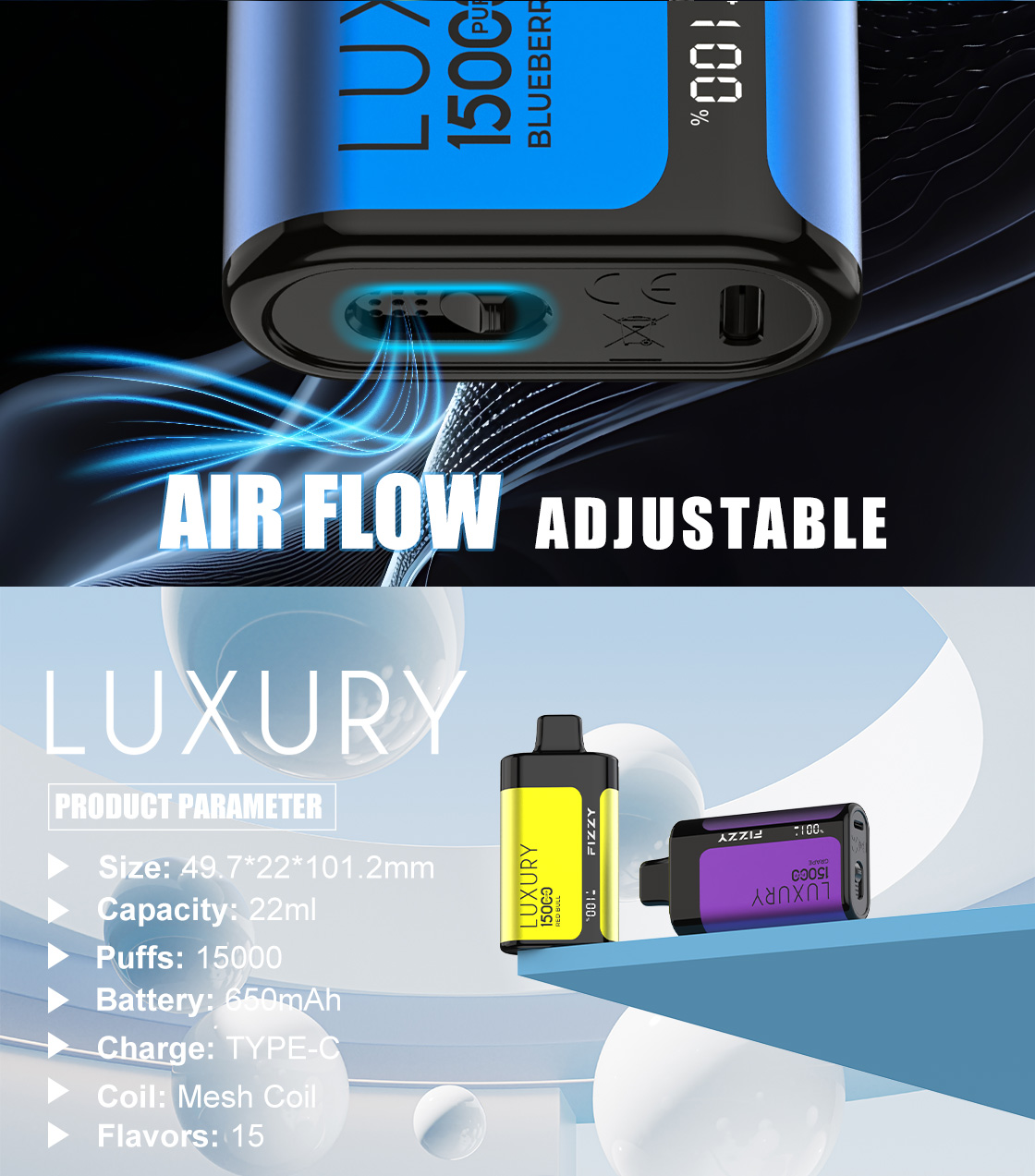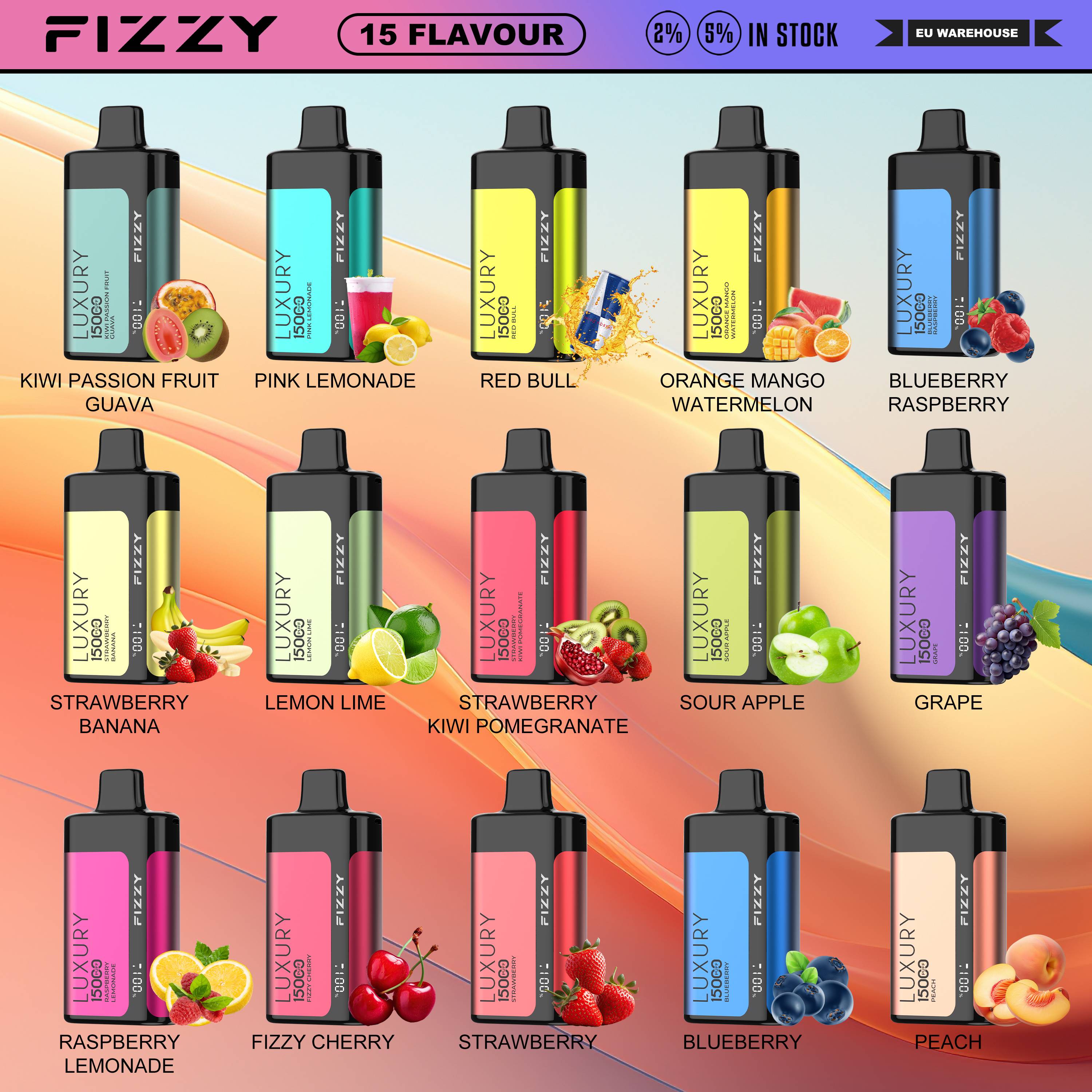 FIZZY LUXURY 15000 PUFFS | EU Warehouse Free Shipping | 15K Puff Disposable Vape | LED Screen Wholesale I Vape | Airflow Adjustable E Cigarettes Vaper